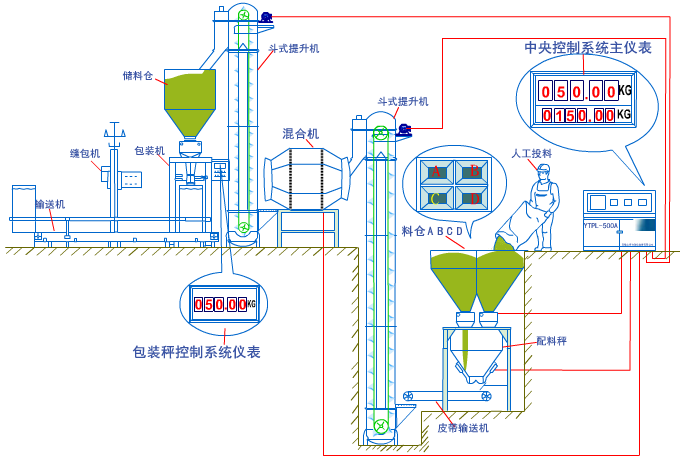 該套生產(chǎn)線廣泛應(yīng)用于各類(lèi)物料多行業(yè)的自動(dòng)配料包裝生產(chǎn)線,配料只需人工將2種以上10種以下的物料投入各料倉(cāng)中,電腦控制系統(tǒng)自動(dòng)將各種物料按預(yù)先設(shè)定好的比例自動(dòng)投放到稱(chēng)重系統(tǒng)中,稱(chēng)重系統(tǒng)將按照每種物料的配料比例自動(dòng)加入,每一次配料完成后由斗式提升機(jī)自動(dòng)將物料提到混合機(jī)中進(jìn)行混和,混合均勻后自動(dòng)排出再由斗式提升機(jī)提到儲(chǔ)料倉(cāng)中供給包裝 系統(tǒng)進(jìn)行自動(dòng)定量包裝。