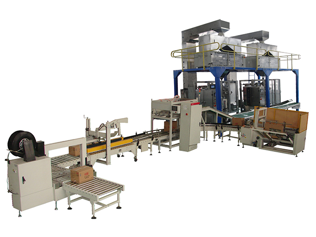 自動理包裝箱生產線由全自動包裝機、開箱機、自動裝箱機、自動封箱機、自動捆扎機等組成。散狀物料經過全自動包裝機進行包裝,包好的袋裝成品通過輸送生產線進行理包整理,轉向排序,加速緩沖,再以一定的數量自動有序的裝入紙箱,通過壓平機進行整理,全自動封箱機構按要求封好紙箱,自動捆扎機進行捆扎帶,最后由物流線輸出。